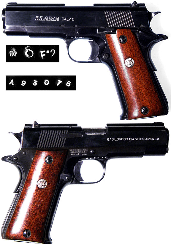 SPANISH Model IX-B semiautomatic pistol # A93076 (.45 ACP), mfg. by Llama in 1985. This is a full-size 1911-type .45 ACP pistol with grip-safety and wood grips. The magazine holds 8 rounds. Bluing is almost full with some minor contact-marks on sides of slide, I figure it to grade 95% though. Bore is mirror-bright and it has a very decent trigger. A really lovely example. PHOTO . . . $350. not C&R SOLD
