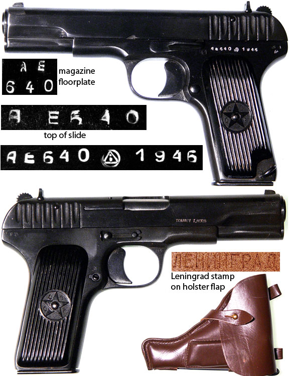 RUSSIAN Model TT-33 Tokarev semiautomatic pistol # AE640 (7.62x25), mfg. by Izhevsk in 1946. Excellent-PLUS condition, with 100% external bluing, bore is mirror-bright with strong rifling. All matching serial numbers including both magazines. Does not have added-on safety lever, grips are intact with the CCCP around star motif. Includes unissued leather holster (stamped "Leningrad" on inside of flap), with cleaning-rod. Subtle import-marks at bottom of slide. PHOTOS . . . $750. C&R SOLD