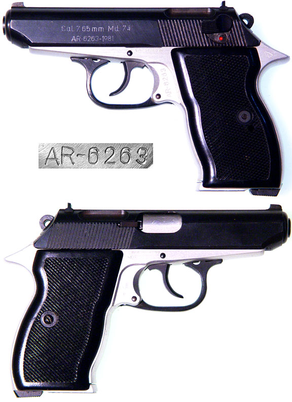 not C&RHUNGARIAN Model 74 semiautomatic pistol # AR-6263 (.32 ACP) mfg. at FÉG in 1981 A Walther PP-clone with brushed aluminum receiver and decocking-lever. Excellent-PLUS condition, looks to be new with gorgeous bright and strong bore. Includes two 8-round magazines (one matching this pistol). PHOTO . . . $175. not C&R SOLD