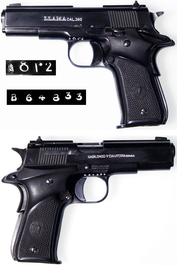 SPANISH Model III-A semiautomatic pistol # B64833 (.380 ACP), mfg. by Llama in 1989. This is a pint-size 1911-type .380 ACP pistol with grip-safety and plastic grips. The magazine holds 7 rounds. Bluing is almost full with some very minor marks on sides of slide, I figure it to grade 95% though. Bore is mirror-bright and it has a very decent trigger. PHOTO . . . $350. not C&R SOLD