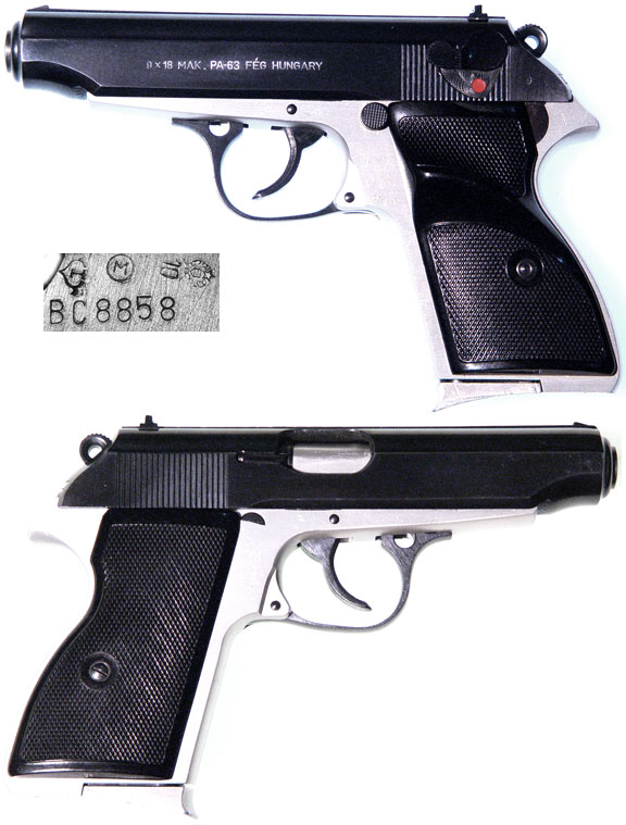 HUNGARIAN Model PA-63 semiautomatic pistol # BC8858 (9x18 Makarov) mfg. at FÉG. A Walther PP-clone with brushed aluminum receiver and decocking-lever. Excellent as-new condition with almost 100% bluing on slide and little (if any) signs of use with mirror-perfect chrome-lined bore. Includes two 8-round pinky-rest magazine (numbered to the gun). PHOTO . . . $195.