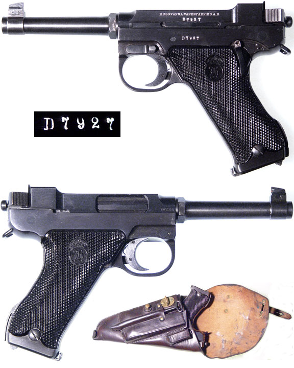 DANISH Model 40 Lahti semiautomatic pistol "rig" # D7927 (9mm Parabellum), mfg. by Husqvarna circa 1948. Excellent PLUS condition, with all-matching numbers, perfect mirror bore, and 99% original bluing. Danish serial # prefix with crowned HV (Honved = home guard) proof at back of frame. Black bakelite grips incorporating the Husqvarna logo. Complete with Swedish full-flap military holster with magazine-loader, cleaning-rod and three 8-round magazines. Not import-marked. PHOTOS . . . $850. C&R SOLD