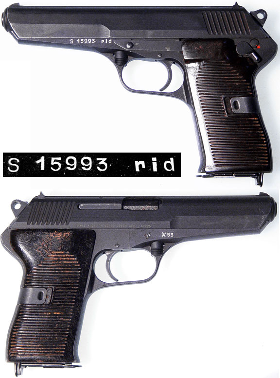CZECH Model CZ-52 semiautomatic pistol # S15993 (7.62x25), mfg. at CZ in 1953. Excellent condition, a VOP rework with full black Parkerized finish. Bore is very shiny and strong. All matching-numbers, includes two magazines, cleaning-rod and new-looking holster (not pictured). PHOTO . . . $250. C&R SOLD