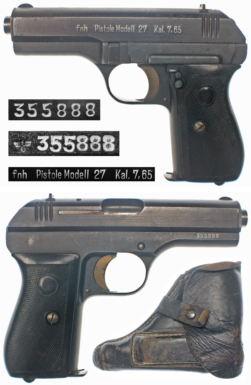BELGIAN Model 1910/22 Browning semiautomatic pistol rig # 90780 (.32 ACP), mfg. at Fabrique National in 1942 under Nazi occupation. Very Good condition with 70% or better original blued finish (top of slide turned brown), has WaA140 acceptance mark on left side of slide and eagle/swastika stamped on left side of slide and frame as well as top of barrel. Bore is quite decent and mostly bright. All matching serial numbers, checkered wooden grips with one 8-round magazine. Not import-marked. PHOTO . . . $900. C&R