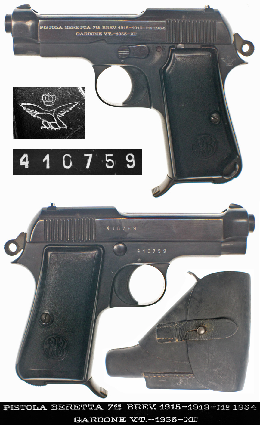 ITALIAN Model 1935 semiautomatic pistol # 543386 (.32 ACP) mfg. by Beretta in 1944 for the German Army. Excellent-PLUS condition with 98% high gloss bluing. Bore is mirror-bright and near perfect, circled 4 UT on left side of grip. Includes one finger-rest 7-round magazine. Not import-marked. PHOTOS . . . $1450. C&R