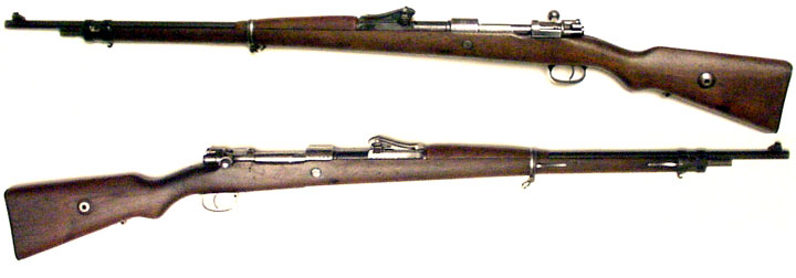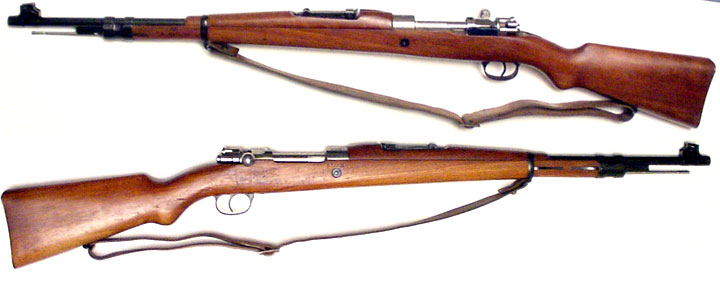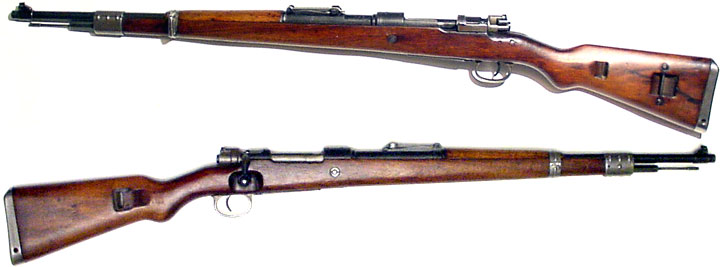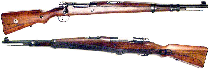 CHILEAN Model 1935 "carbiniero" carbine #7994 (7x57mm) mfg. by Mauser (with the famous banner trademark on rear of receiver) in 1935. Excellent, with all-matching numbers (including cleaning-rod). Excellent, bright mirror bore, 96% original commercial-quality bluing, slightly worn on the rear bridge of the receiver, gorgeous crest. Wood has 1935-dated acceptance cartouche on left side and only moderate handling marks, and includes original sling. These are very scarce rifles and really fantastic shooters. PHOTOS . . . $650. C&R SOLD