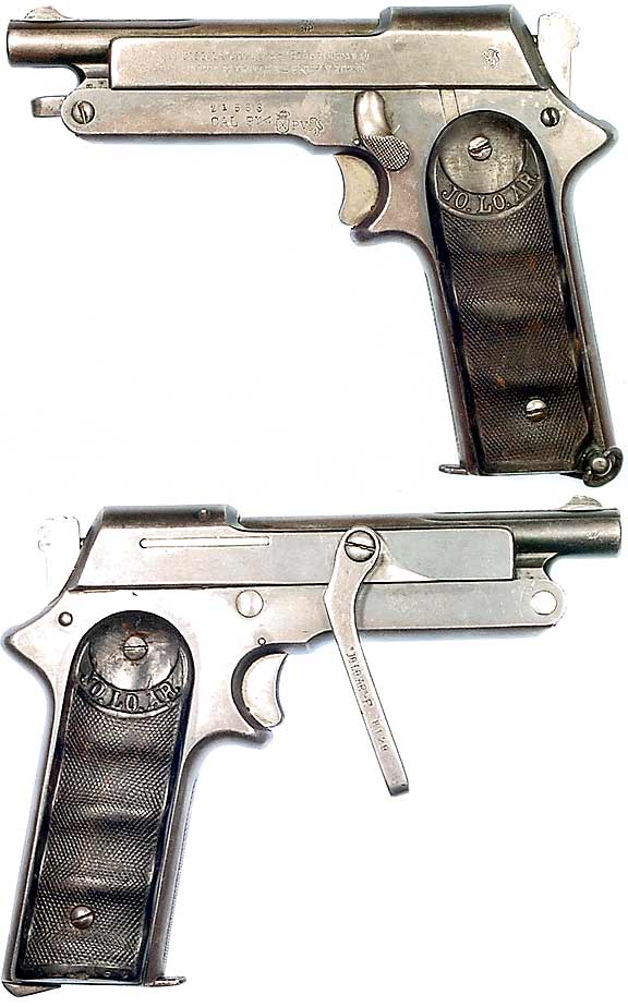 SPANISH Model JO. LO. AR semiautomatic pistol #21558 (.380 ACP), mfg. in Eibar in 1925. Good condition (these are usually found very worn externally), with 30-40% original bluing but a really nice, excellent bore. This unique pistol-design has several groundbreaking features, including a tip-up barrel for loading the chamber, and an awkward-looking but effective swinging-bar attached to the right side of the slide to allow one to cock the pistol one-handed. Bakelite logo-grips with finger-grooves and a nine-shot magazine. Not import-marked, scarce, and rarely seen in nicer condition. PHOTOS . . . $425. C&R SOLD