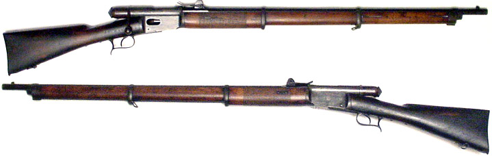SWISS Model 1869/71 Vetterli bolt-action infantry rifle #23236 (10.4mm rimfire) mfg. by W. von Steiger in Thun in 1872. Very Good overall, with nearly full bluing (much turned brown), case-colors on receiver still vivid. All-matching numbers, bore extremely bright with very strong rifling, some crustiness the last few inches of barrel. Wood is quite nice maple, with original finish and some scrapes and dings and a chunk missing at toe of buttplate, no cleaning-rod present. Not import marked. Includes five (5) rounds of the rare 10.4 Swiss rimfire ammo. Scarce manufacturer for these. PHOTO . . . $275. Antique, no FFL required