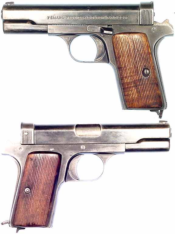 HUNGARIAN Model 29M Frommer semiautomatic pistol #24718 (.380 ACP), mfg. by Femaru Fegever (FEG) circa 1934. Very Good condition, with all-matching numbers, grainy but strong bore, and 80% or so original bluing with some minor wear at corners and edges of high-gloss finish. This was the official sidearm of the Hungarian Army throughout the early 1930's and is an excellent design with a grip-safety. Grooved-walnut grips a bit scratched-up, 37M-marked seven-round magazine. Not import-marked, scarce. PHOTOS . . . $225. C&R SOLD
