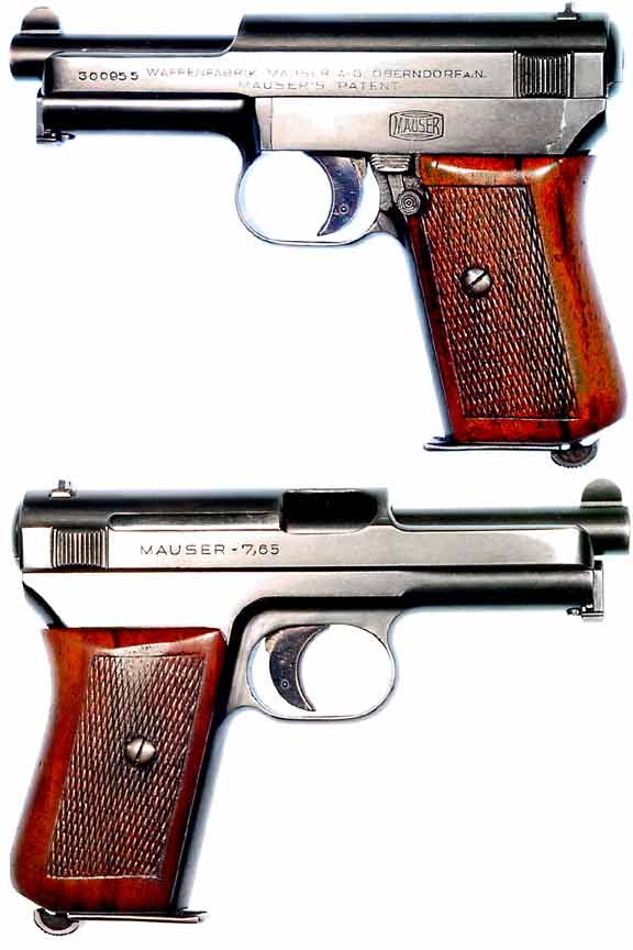 GERMAN Model 1914 semiautomatic pistol #300955 (7.65mm, .32 ACP) mfg. by Mauser at Oberndorf c.1923. All-matching numbers, Excellent condition, 95% or better bluing with deep fire-blue on trigger, extractor and takedown lever. Excellent bright bore with sharp rifling. Really nice checkered-walnut grips. Not import-marked. PHOTOS . . . $325. C&R SOLD