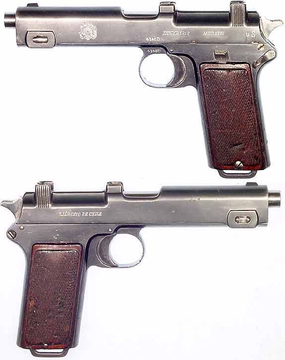 CHILEAN Model 1911 Steyr-Hahn semiautomatic pistol #4140D (9x22.5 Steyr) mfg. by Steyr in 1912. Excellent condition with 95% bluing, all-matching numbers, with a near-perfect mirror-bore. Chilean crest on left side very bold, as is EJERCITO DE CHILE marking on right side, nice checkered wooden grips. One of only 5,000 pistols manufactured for the Chilean contract and quite literally the nicest example of a Steyr-Hahn I have ever seen, not import-marked. PHOTOS . . . $575. C&R SOLD