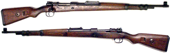 GERMAN Model 98k bolt-action Mauser rifle #1442d (8mm) mfg. by the French occupiers of Mauser, Oberndorf (code svwMB) from August 1945 until May 1946. Very Good condition, with excellent, mirror-bore. Stamped barrel-bands and trigger-guard in the white, barrel, receiver, and bolt have 80-90% blue. Bent-down Gew.98 bolt stamped 442 on tang to match receiver. Kriegsmodel stock has no disassembly-lug, buttplate has hole in bottom for the same purpose. Auxiliary sling-bar inlet into left side of stock, false bayonet-lug / cleaning-rod screwed into forend of stock. Wood quite secent with minimal handling-marks. Scarce, not import-marked. PHOTOS . . . $375. C&R SOLD