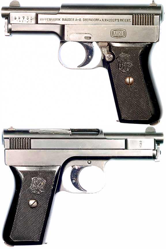 GERMAN Model 1910 semiautomatic pistol #59733 (6.35mm, .25 ACP) mfg. by Mauser at Oberndorf c. 1913. All-matching numbers (and every tiny little piece is numbered), Excellent condition with 95% bluing and deep fire-bluing on trigger, bore somewhat pitted but still shiny with strong lands & grooves. Has Austrian property-marks (9476.13 between the Vienna Nitro-proof and Hapsburg eagle underneath the serial # on left side of slide) and the German commercial proof (double-crowned U on right side of slide). Nice black-bakelite grips with WM monogram. Has crudely-made replacement-extractor and replacement magazine which does not lock back slide, Not import-marked. PHOTOS . . . $275. C&R SOLD