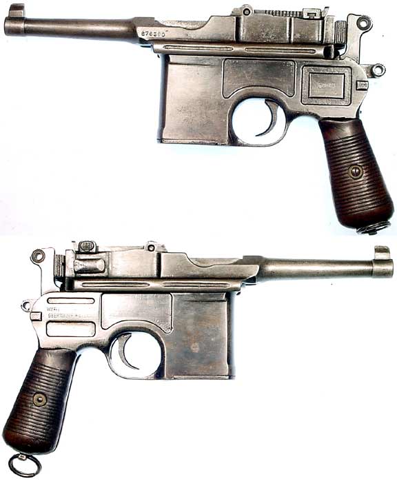 GERMAN Model 1896 "Broomhandle" semiautomatic pistol #676360 (7.63 Mauser) mfg. at Mauser in c.1929. An original-finish "bolo" model with 3.9" barrel, all visible numbers except that on slide matching. Good condition, with around 30% original bluing with quite a bit of external pitting. Pistol is functional (except for bent-down extractor) and all parts fit well. Bore is a sewer-pipe with traces of rifling, walnut grips in very good condition. Quite possibly a clever Chinese copy, not import-marked. PHOTO . . . $350. C&R SOLD
