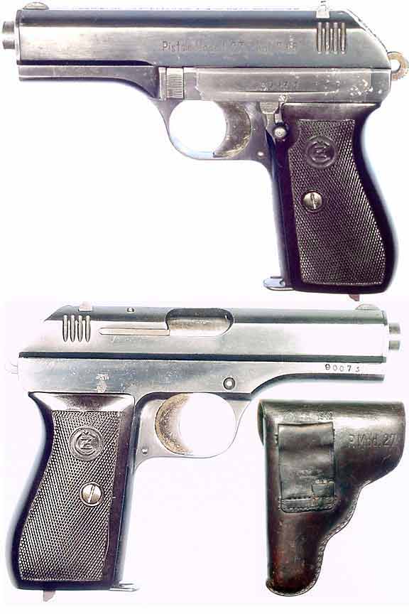 CZECH Model CZ-27 semiautomatic pistol #90073 (.32 ACP) mfg. by Ceska Zbrojovka AG, Strakonice in early 1942. Excellent condition with 96% original high-polish blue and nearly full "straw" color on trigger. Some very minor pitting on left side of slide slide and a clump of verdigris on left side above grip. All-matching numbers, Nazi-marked with eagle and WaA76 on right frame and eagle holding Swastika on top-rail. Near-perfect mirror-bore, original dark-brown bakelite grips without any cracks or chips. Not import-marked. INCLUDES original black-leather military holster dated 1942 and bearing same WaA76 as pistol in Very Good condition with one 7-round P-27 marked magazine. PHOTOS . . . $375. C&R