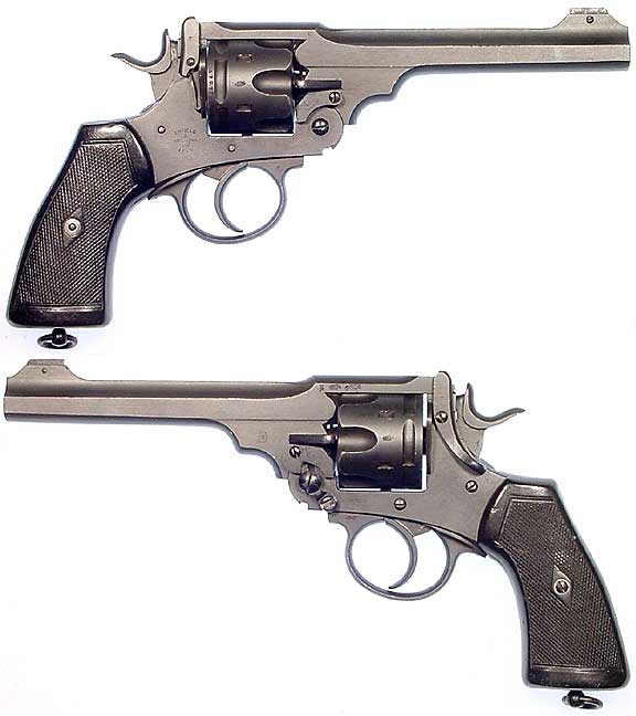 BRITISH Mark VI revolver #A7976 (.455 Webley) mfg. by Enfield in 1926. Excellent-PLUS condition with 99% full original phosphate finish, a gorgeous mirror-bore, and all-matching numbers. Australian property-marked (broad-arrow inside large D) with numbers 5 over 270 stamped on the back-strap. Enfield-made Mark VI revolvers are by no means common, and this one being unaltered and in such a high state of preservation entitles me to state "worthy of the finest collection" and really mean it! Not import-marked, rare. PHOTOS . . . $950. C&R