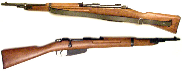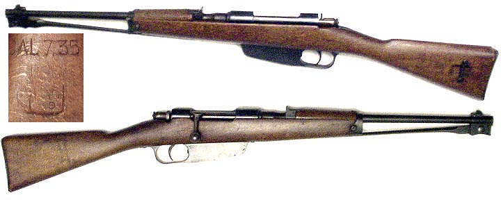 ITALIAN Model 38 Mannlicher-Carcano short-rifle #N9609 (7.35x53) mfg. by Terni in early 1939 (year XVII of Mussolini's rule) with fixed rear-sight. Finnish property-mark [SA] on left side of receiver. Excellent condition, with nearly full 98% bluing and an excellent, mirror-bright bore. Bent-bolt not numbered (as usual) and stock does not match receiver (# F2894). Wood is unusually nice and has NOT been sanded, but has two 1" hairline cracks at tang. Receiver has been drilled & tapped at top for scope (holes now filled with two small bolts and nearly un-noticeable). Includes excellent Finn Model 28 green-leather sling with oval buckle PHOTOS . . . $125. C&R