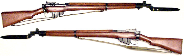 BRITISH Model SMLE No.4 Mk.2 #PF387376 (.303 British) mfg. at Fazakerly in September, 1953 All-matching numbers, overall Excellent condition with near-perfect, mirror 5-groove bore, number 1-marked bolt-head, and milled ladder-type rear-sight. Metal has 90% remaining stoving (thinning at corners), wood has nearly zero handling-marks, includes matching-numbered No.9 blade bayonet & scabbard. A very handsome rig. PHOTOS . . . $275. C&R SOLD