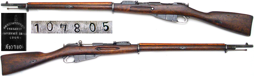 FINN Model 1891 Mosin Nagant bolt-action rifle # 107805 (7.62x54R) mfg. at Tula in 1900 with [SA] property marking on left side of barrel-shank. Near Excellent condition, most bluing remaining with very strong markings, including Russian eagles. Bolt-body stamped 107805. Bore is mostly bright with strong rifling, has been counterbored at muzzle. Russian one-piece stock has 1" x 3.5" arsenal repair on left side with few handling marks. Includes cleaning rod. PHOTOS . . . $275. C&R