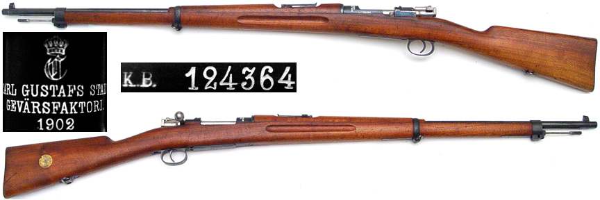 SWEDISH Model 96B Mauser bolt-action rifle # 124364 (6.5x55), mfg. by Carl Gustaf in 1902 with straight-bolt and threaded muzzle (with screw-on cap). Excellent condition, with 95% bluing on all metal parts. Has very strong markings and a very bright and strong bore (disk marked 6.51/1). All matching numbers (except cleaning rod, which never match), streaked walnut stock & handguard has very few handling-marks (mostly compressions from adjacent rifles during transportation and storage). PHOTOS . . . $325. C&R SOLD