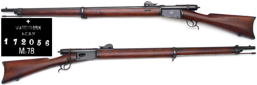SWISS Model 1878 Vetterli bolt-action infantry rifle # 172056 (10.4mm Swiss rimfire) mfg. by Waffenfabrik Bern in c.1878. Excellent condition, all-matching numbers (and every part is numbered). All original blued finish essentially as nice as these ever get. Bore is mostly bright (some gunk in the grooves) with very strong rifling. Wood is walnut with its original finish (cartouches clear) having only a few minor handling-marks and dings. Includes cleaning-rod. Not import-marked. PHOTOS . . . $475. Antique, no FFL required SOLD