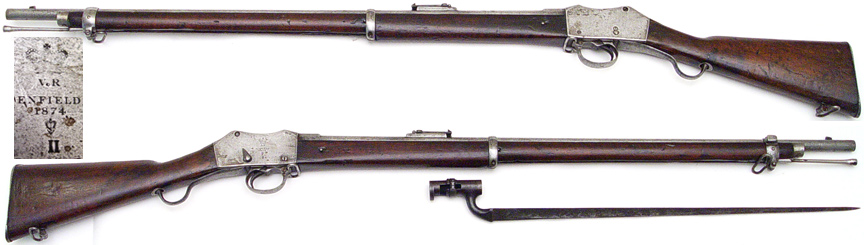 BRITISH Martini-Henry Mark II long-lever single-shot rifle without serial number (.577/450) mfg. by Enfield in 1874 with correct socket-bayonet. Good condition with no external finish and very little pitting. All original (not a Khyber-pass copy) and functional with a dark bore that has strong rifling. Original stock and handguard sound with no cracks or splits (repaired at tang). Includes U.S. Army bringback documentation from Afghanistan. No import-marks, a nice shootable Martini with correct and functional bayonet. PHOTOS . . . $850. Antique, no FFL required SOLD