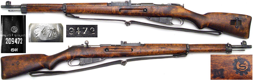 FINN Model 39 Mosin-Nagant bolt-action rifle # 209472 (7.62x54R) mfg. by SAKO in 1941 with PUOLUSTUSLAITOS on barrel-shank, pistol-grip stock. Very Good condition with 50% remaining bluing on all metal parts and quite bright very strong bore (NOT counterbored at muzzle). Matching bolt-knob, numbers on magazine-floorplate matching (9472) but number on buttplate scrubbed. Includes cleaning-rod. Two-piece nicely figured wartime stock (rounded finger-joints) has bold SAKO cartouches on right side with quite a few of the expected handling-marks and scuffs from actual use. PHOTOS . . . $425. C&R SOLD