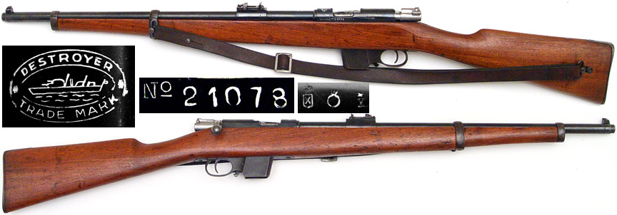SPANISH Model 1921 Destroyer bolt-action carbine # 21078 (9x23 Largo) mfg. by Ayra Duria in 1952. Excellent condition with 90% bluing and a sharp mirror-bore and matching bolt. Stock is quite nice with some minor dings and compressions. PHOTOS . . . $425. C&R SOLD