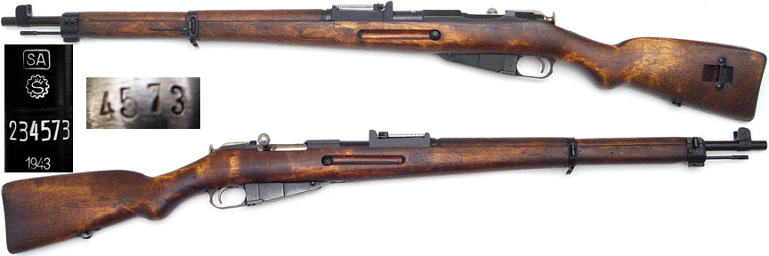 FINN Model 39 Mosin-Nagant bolt-action rifle # 234573 (7.62x54R) mfg. by SAKO in 1943. Excellent-PLUS condition with 100% bluing on all metal parts and a mirror-bright bore (NOT counterbored at muzzle). Matching bolt-knob, numbers on magazine-floorplate not matching (as usual), buttplate scrubbed. Includes cleaning-rod. Very attractive figured two-piece wartime stock (rounded finger-joints) with a few dings and minor handling marks but is sound with little apparent wear. PHOTOS . . . $380. C&R