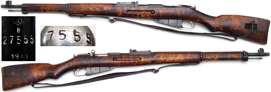 FINN Model 39 Mosin-Nagant bolt-action rifle # 27555 (7.62x54R) mfg. by VKT in 1941. Very Good or better condition with 75% remaining bluing on all metal parts and quite bright very strong bore (NOT counterbored at muzzle). Matching bolt-knob, numbers on magazine-floorplate matching (7555) but number on buttplate scrubbed. Includes cleaning-rod and [SA] marked brown leather sling. Three-piece nicely figured wartime stock (rounded finger-joints) has quite a few of the expected handling-marks and scuffs from actual use. PHOTOS . . . $295. C&R