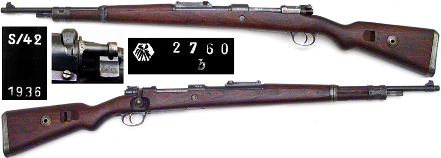 GERMAN Model 98k bolt-action rifle # 2760b (8mm), mfg. by Mauser (factory code S/42) in 1936. A "bringback" in Near Excellent condition, with 80% bluing. Basically this has been put together from three rifles. The bolt (and all bolt-parts) is numbered 3692r, the barreled action, rear sight, trigger assembly, magazine and rear barrel band is numbered 2760 (all bolts numbered 60), the stock and front band is numbered 1952n. Has an attractive laminated stock with bpr-41 marked cupped buttplate and clear eagle / H on right side. Bore is excellent and mirror-bright, two intact Weimar eagles on left side, three Weimar eagle proofs on right side of receiver. Missing barrel-band spring. Not import marked. PHOTOS . . . $675. C&R SOLD