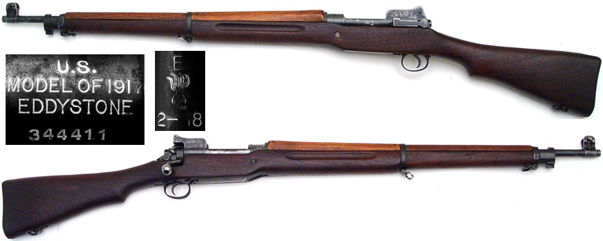 U.S.A. Model of 1917 bolt-action infantry rifle # 344411 (.30-06) mfg. by Eddystone in February, 1918. Very Good condition with 70% or better blued finish on metal and a gorgeous mirror-bright bore. NOT ENGLISH MAKE stamped on left side of receiver. Stock has no cartouches and few minor handling-marks, handguard is of lighter shade. Not import-marked. PHOTOS . . . $675. C&R