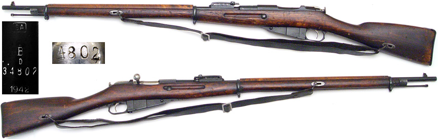 FINN Model 1891 Mosin Nagant bolt-action rifle # 34802 (7.62x54R) barrel mfg. at Fabrique National in 1942. Excellent condition, full bluing remaining with very strong markings. Bolt-knob stamped 4802. Bore is mirror-bright and very sharp. One-piece stock has some of the expected handling marks with wire-type sling swivels and green leather Finn sling. Includes cleaning rod. PHOTOS . . . $350. C&R SOLD