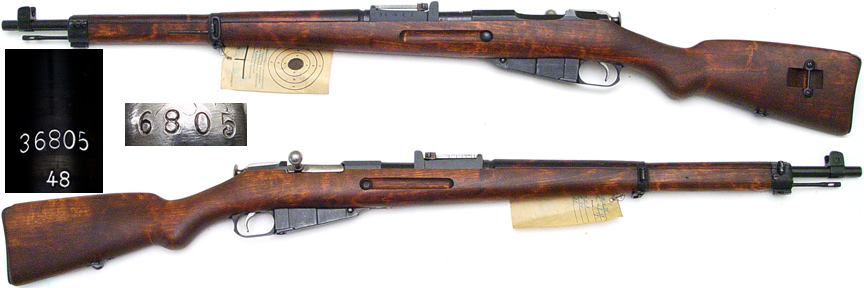 FINN Model 39 Mosin Nagant bolt-action rifle # 36805 (7.62x54R), No Maker, barrel simply stamped 48. Excellent-PLUS condition, full bluing on all metal parts (barrel has a reddish hue). Bolt-knob stamped 7825. Bore is mirror-bright and very sharp. New-looking two-piece postwar stock (square finger-joints) has only a few minor handling marks. Includes cleaning rod, attached Finn arsenal tag (dated 9 Oct 1975) shows the bore-state as 7.58/1 (better than perfect). Rare. PHOTOS . . . $575. C&R