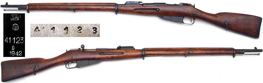 FINN Model 1891 Mosin Nagant bolt-action rifle # 41123 (7.62x54R) barrel mfg. at Tikka in 1942. Excellent condition, full bluing remaining with very strong markings. Bolt body stamped 41123. Bore is dark and rough with strong rifling (may "shoot clean"). One-piece stock has wire-type sling swivels has some handling marks and an arsenal repair near toe. Includes cleaning rod. PHOTOS . . . $275. C&R