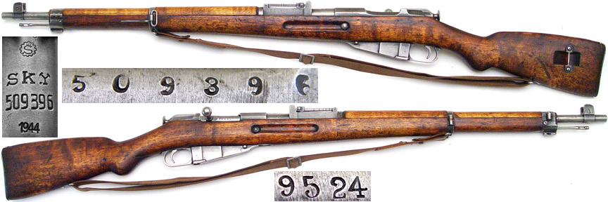FINN Model 39 Mosin-Nagant bolt-action rifle # 509396 (7.62x54R) mfg. by SAKO in 1944 with SK.Y marked barrel and buttstock. Good condition with basically no remaining bluing on metal parts with a bright very strong bore (NOT counterbored at muzzle). 9396 stamped on bolt-knob and magazine-floorplate, buttplate number scrubbed (as usual), 9524 stamped on right side of barrel shank. Includes cleaning-rod and SK.Y-marked 28/30 web sling. Two-piece wartime stock (rounded finger-joints) looks as if it has "been there and done that" with very faint 43-dated SK.Y cartouche on right side. PHOTOS . . . $300. C&R SOLD