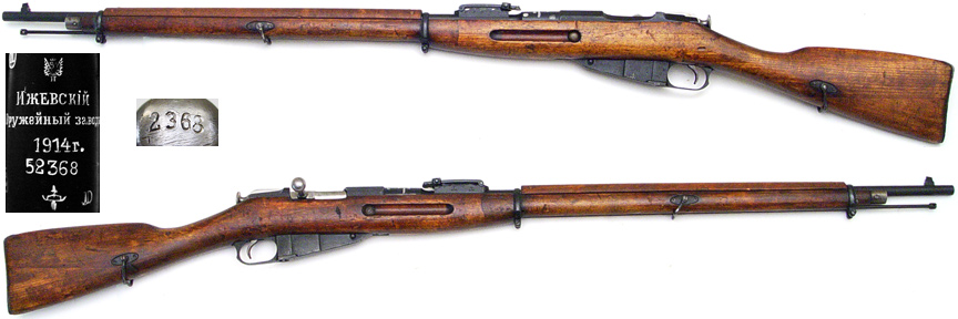 FINN Model 1891 Mosin Nagant bolt-action rifle # 52368 (7.62x54R) mfg. at Izhevsk in 1914 with [SA] property marking on left side of barrel-shank. Excellent condition, full bluing remaining with very strong markings, including Russian eagles. Bolt-knob stamped 2368. Bore is very bright with strong rifling, NOT counterbored at muzzle. Finn two-piece stock wire-type sling swivels and the typical scrapes and handling marks. Includes cleaning rod. PHOTOS . . . $295. C&R SOLD
