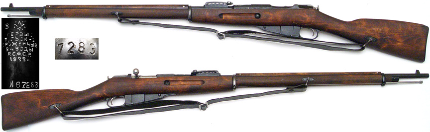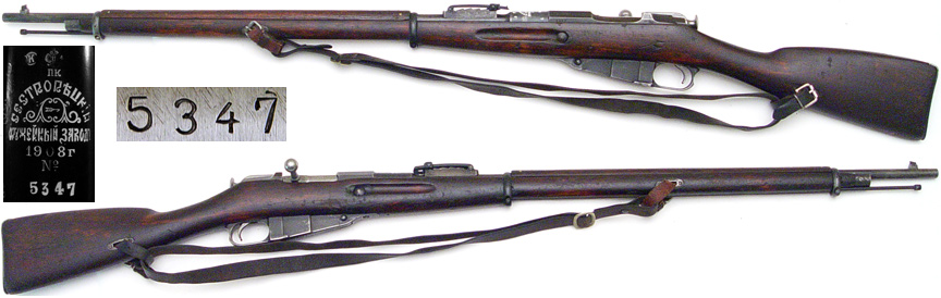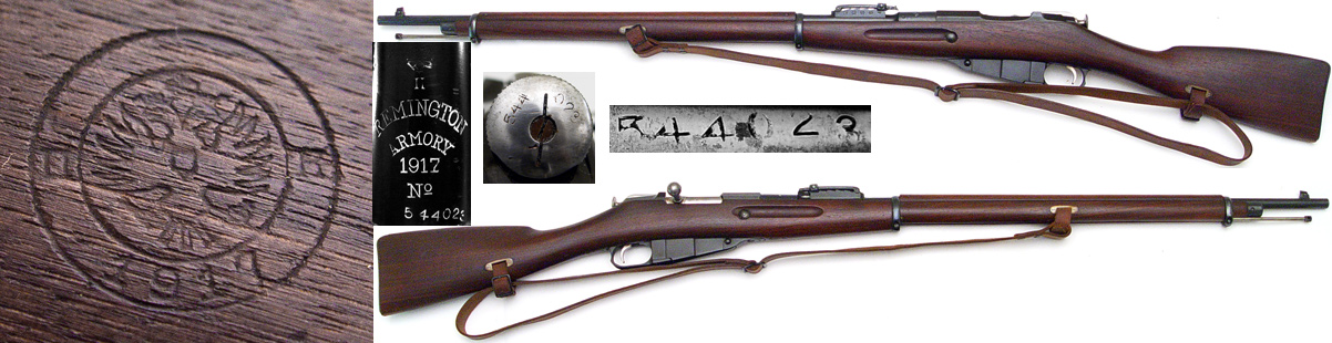 RUSSIAN Model 1891 Mosin Nagant bolt-action rifle # 544023 (7.62x54R) mfg. at Remington Armory in 1917. Excellent-PLUS, literally UNISSUED condition, 100% bluing with very strong markings and a mirror-perfect bore. All matching numbers, including bolt cocking-piece, gorgeous American Black Walnut stock is like new with very bold Russian cartouche on right side, small flaming-bomb U.S. cartouche on bottom of stock just forward of magazine. Includes cleaning rod and leather sling, not import-marked, a literally unimprovable example worthy of the finest collection. PHOTOS . . . $2450. C&R SOLD