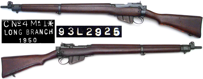 CANADIAN Enfield C No.4 Mk.I* bolt-action rifle # 93L2925 (.303 British) mfg. by Long Branch arsenal in 1950. Near Excellent condition, with full blued finish (magazine browned), all-matching numbers with a #0 marked bolt-head. 4-groove bore is mirror-bright and strong (showing little if any actual use), has CMk.3 stamped ladder rear-sight. Walnut stock and handguards are sound with a few dings and handling-marks. Serial number painted on bottom of stock. PHOTOS . . . $425. C&R