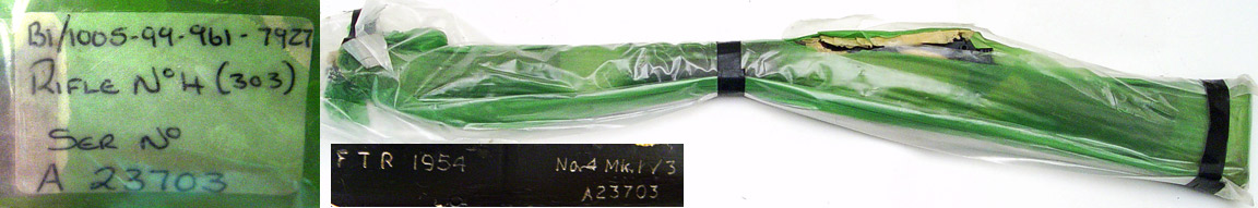 BRITISH Enfield No.4 Mk.1/3 bolt-action rifle # A23703 (.303 British) originally made by Savage-Stevens and has undergone a Factory Thorough Repair to NEW condition in 1954. UNISSUED, still in factory wax wrap in green plastic bag sealed with black tape. Left side of bag has been slit to reveal serial number, original arsenal tag still intact and readable inside bag. The Mark 1/3 designation indicates a Mk.1* rifle that has been upgraded to the Mk.2 configuration. PHOTOS . . . $750. C&R SOLD