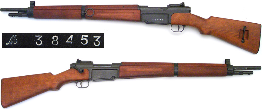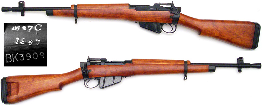 BRITISH Model No.5 Mk.1 Enfield bolt-action "Jungle Carbine" # BK3909 (.303 British) mfg. at B.S.A. Shirley in 1947. Excellent-PLUS condition, with 100% intact military stoving (glossy black paint) on metal. Stock and bolt matching receiver, magazine not numbered, with strong mirror-bright 5-groove bore and 0-marked bolt-head. Wood looks nearly new with a few minor compressions. A very lovely example, not import-marked. PHOTOS . . . $675. C&R SOLD