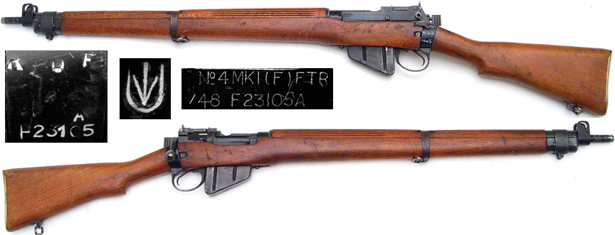 SOUTH AFRICA Enfield No.4 Mk.1 bolt-action rifle # F23105A (.303 British) mfg. by Fazakerly in 1942 and has undergone a Factory Thorough Repair at Fazakerly in 1948. Excellent condition, an all-matching rifle (including magazine) with a mirror-perfect bore. Has South African ownership marks (arrow inside large U) above chamber. Stock and handguard has a few nicks and contact marks. PHOTOS . . . $425. C&R SOLD