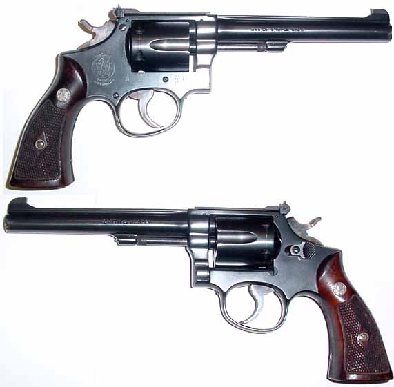 SMITH & WESSON .22-32 Hand Ejector Model revolver #K101072 (.22 LR) mfg. circa 1948. Near Excellent condition, only a very slight amount of holster-wear at sides of muzzle else 98% original bluing remaining. M.P. lightly scratched on wood bottom of right grip. PHOTOS . . . $575. C&R SOLD