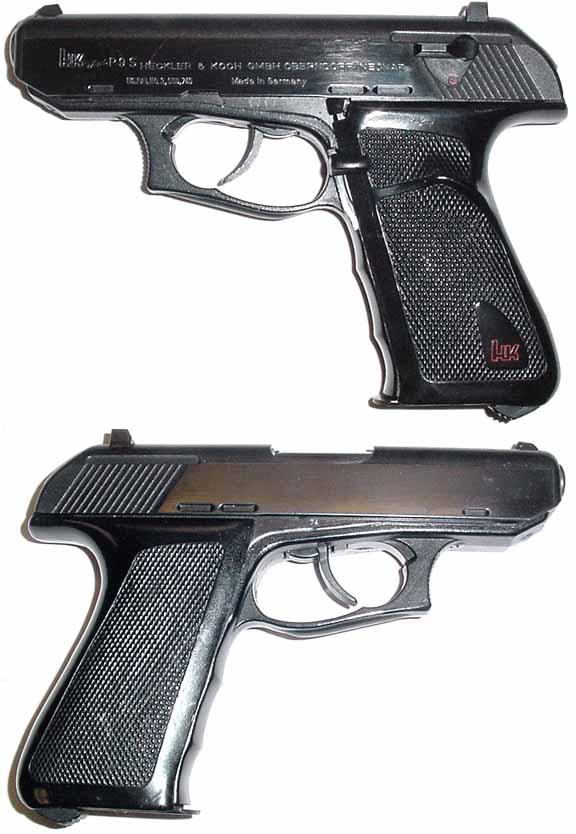 HECKLER & KOCH Model P9S semiautomatic pistol # 105 620 (9mm) mfg. at Oberndorf in 1978. Excellent condition with 100% blue, a gorgeous mirror-bore and one 9-round magazine. This is an unusual type pistol in that it has a cocking-lever on the left side and uses a roller-mechanism (like the G3 rifle) to lock the slide when firing. There is also a manual safety and a loaded-chamber indicator, and they are both comfortable to fire as well as amazingly accurate. Right side of slide has agency markings removed. Includes original box (with original price-tag of $1150.00 still affixed). PHOTOS . . . $675.