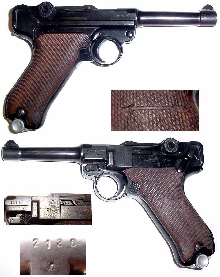 GERMAN Model P-08 Luger semiautomatic pistol #2136c (9mm) made by Mauser in 1938 (S/42 code). Near excellent condition, refinished long ago, with 95% or better bluing. All-matching numbers (including the aluminum-bottom magazine), barrel has been replaced with crown/N marked commercial barrel (likely the same time the gun was reblued) and the bore is excellent and mirror-bright. Checkered walnut grips in decent condition, the left one with a long fletched-arrow cartouche pointing forwards. Includes repro black-leather Luger holster. All markings very strong. Not import-marked. PHOTO. . . $625. C&R SOLD