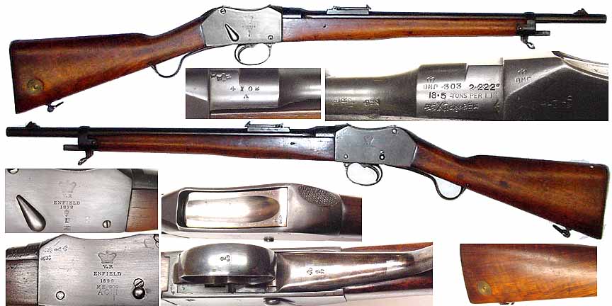 BRITISH Martini-Enfield Artillery Carbine Mark III single-shot rifle #4102A (.303 British) mfg. by Enfield as a Martini-Henry Mark I rifle in 1872 and converted to its current configuration (all Artillery carbines are actually converted .577 rifles) at Enfield in 1899. Excellent condition, a really spectacular example with full external bluing (the bolt and cocking-lever color case-hardened). The bore is unbelievably pristine and the wood, though refinished long ago, is quite beautiful with no cracks and a subtle fiddleback figure. By far the finest example I have ever seen, as it is British NITRO-proofed, I would not hesitate to fire this little fella with modern .303 loads, either. No import-marks. PHOTOS . . . $650. antique, no FFL required SOLD