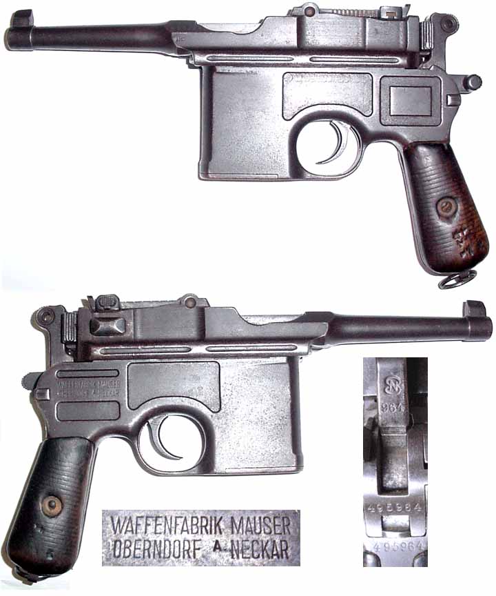 GERMAN Model 1896 "Bolo" Broomhandle semiautomatic pistol #495964 (7.63 Mauser) mfg. at Mauser circa 1922. Good condition, oxidized external surfaces but has all original parts, is completely functional, all external numbers are matching and it does not appear to have been "fiddled-with" at all. Bore the usual sewer-pipe but a perfect candidate for re-sleeving and refinishing. PHOTOS . . . $350. C&R SOLD
