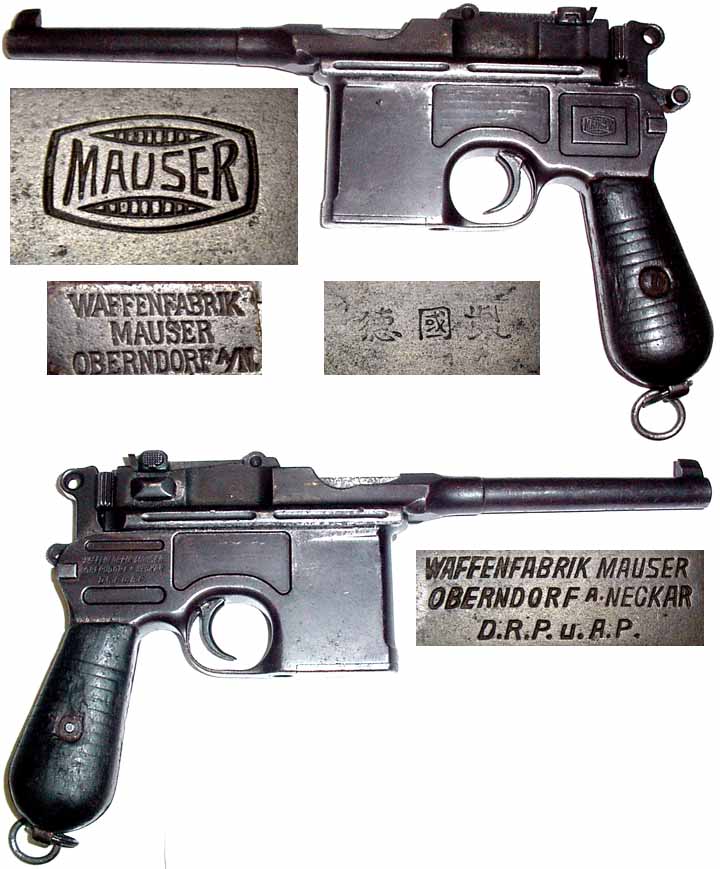 GERMAN Model 1930 Broomhandle semiautomatic pistol #866052 (7.63 Mauser) mfg. at Mauser circa 1932. Very Good condition, somewhat oxidized external surfaces but appears to have all original parts, is completely functional and it does not appear to have been "fiddled-with" either. Bore at least somewhat bright with traces of rifling, a perfect candidate for re-sleeving and refinishing. Has three small Chinese characters lightly stamped on left side (see PHOTOS) . . . $375. C&R SOLD