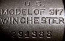 U.S.A. Model of 1917 bolt-action rifle #291388 (.30-06) mfg. by Winchester in May, 1918. Excellent-plus condition, with 100% dark-gray parkerized finish and a lovely mirror-bright near-perfect bore. Very strong markings (note receiver reads "Model of 917" instead of 1917), Black-walnut Eddystone-marked buttstock has quite vivid fiddleback pattern, handguard is made of Beech and lighter in color. Wood has very few contact and handling-marks. Rear sight and bolt are of Remington manufacture, includes proper Model 1917 Kerr khaki sling. Not import-marked. . . $525. C&R