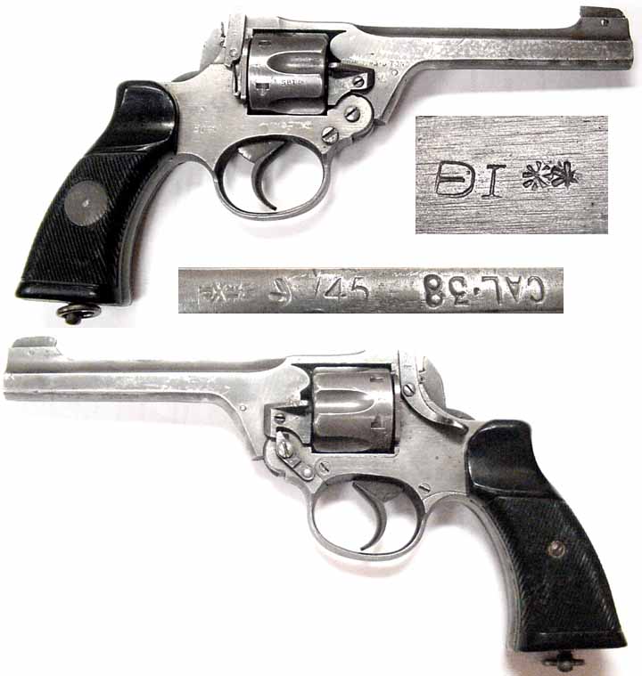 BRITISH Model No.2 Mk.I** revolver #ZH4240 (.38/200 Enfield, aka .38 S&W) mfg. at Enfield in 1945 with acceptance-date on barrel-rib of 1945. Right side of frame marked ŠI««. All-matching numbers in Very Good overall condition with none of the usual black-painted finish ("stoving") remaining. Bore is excellent (very strong and mirror-bright). Bakelite thumb-groove grips have brass unit-disc on right side and a couple superficial chips and dings. All markings very sharp and distinct. PHOTOS . . . $200. C&R SOLD